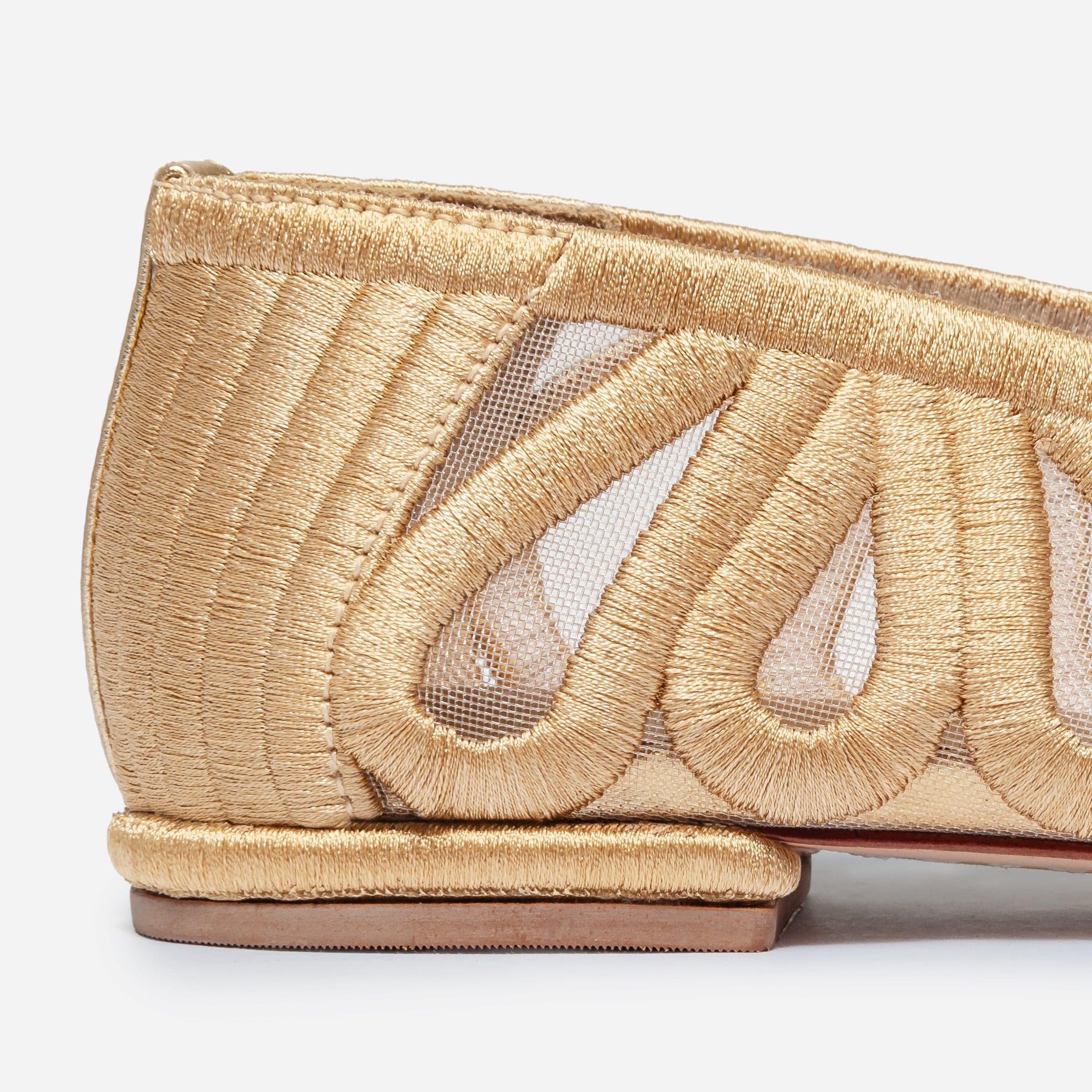 Delicate delight. A mesh ballet flat that combines subtle allure with refined detail. A whisper of skin creates soft intrigue, while teardrop embroidery brings texture and artistry to the mesh