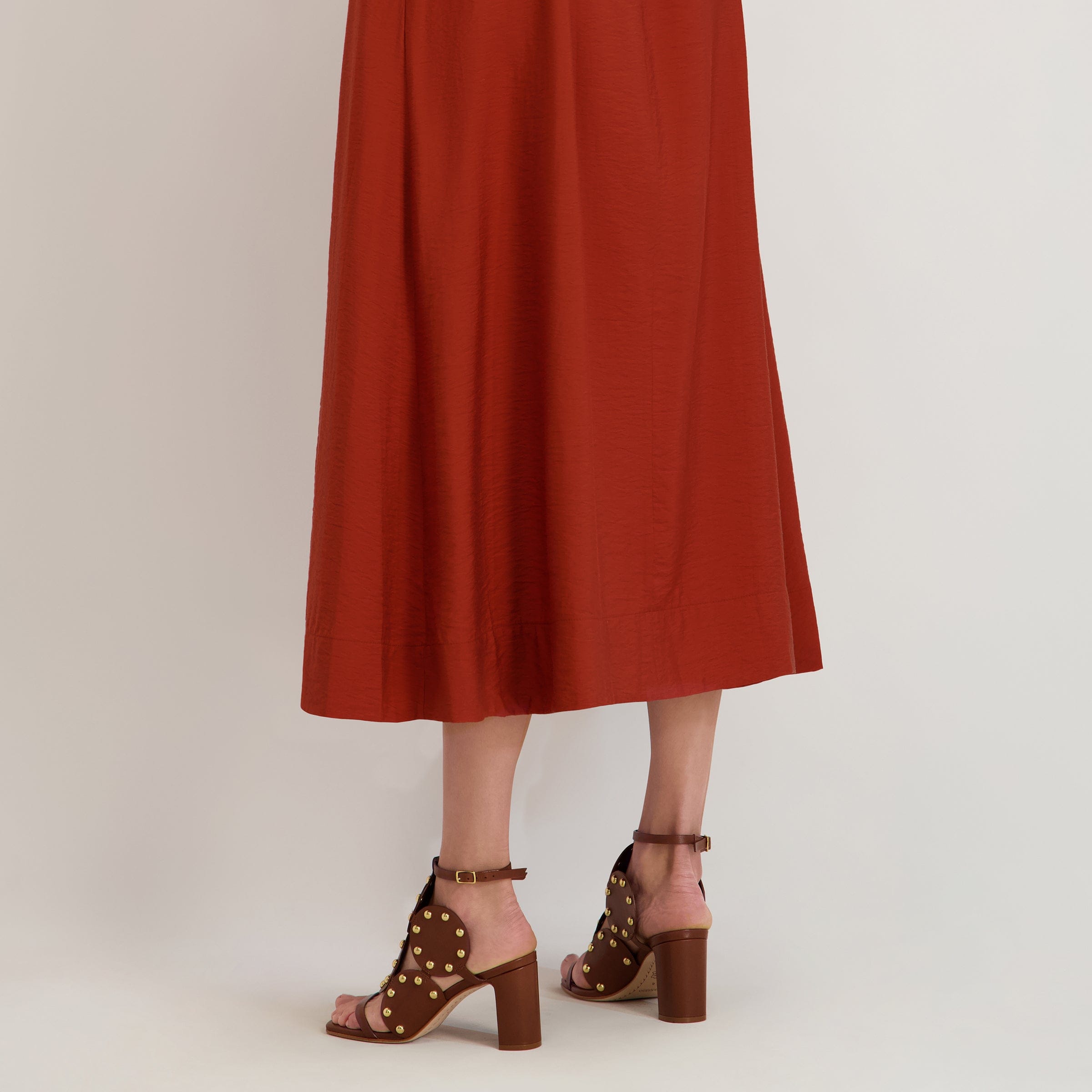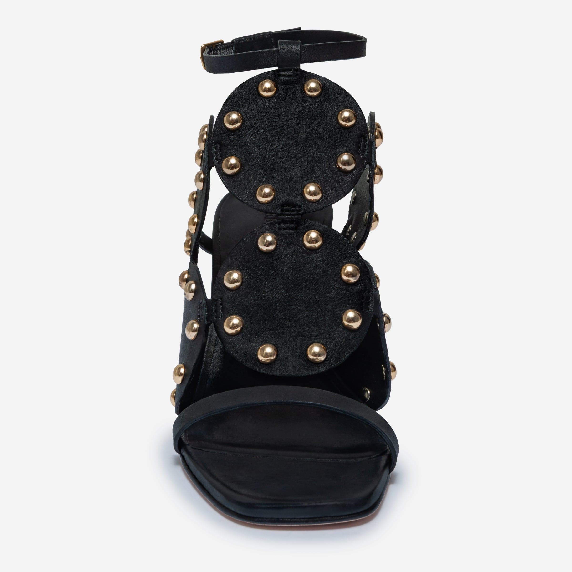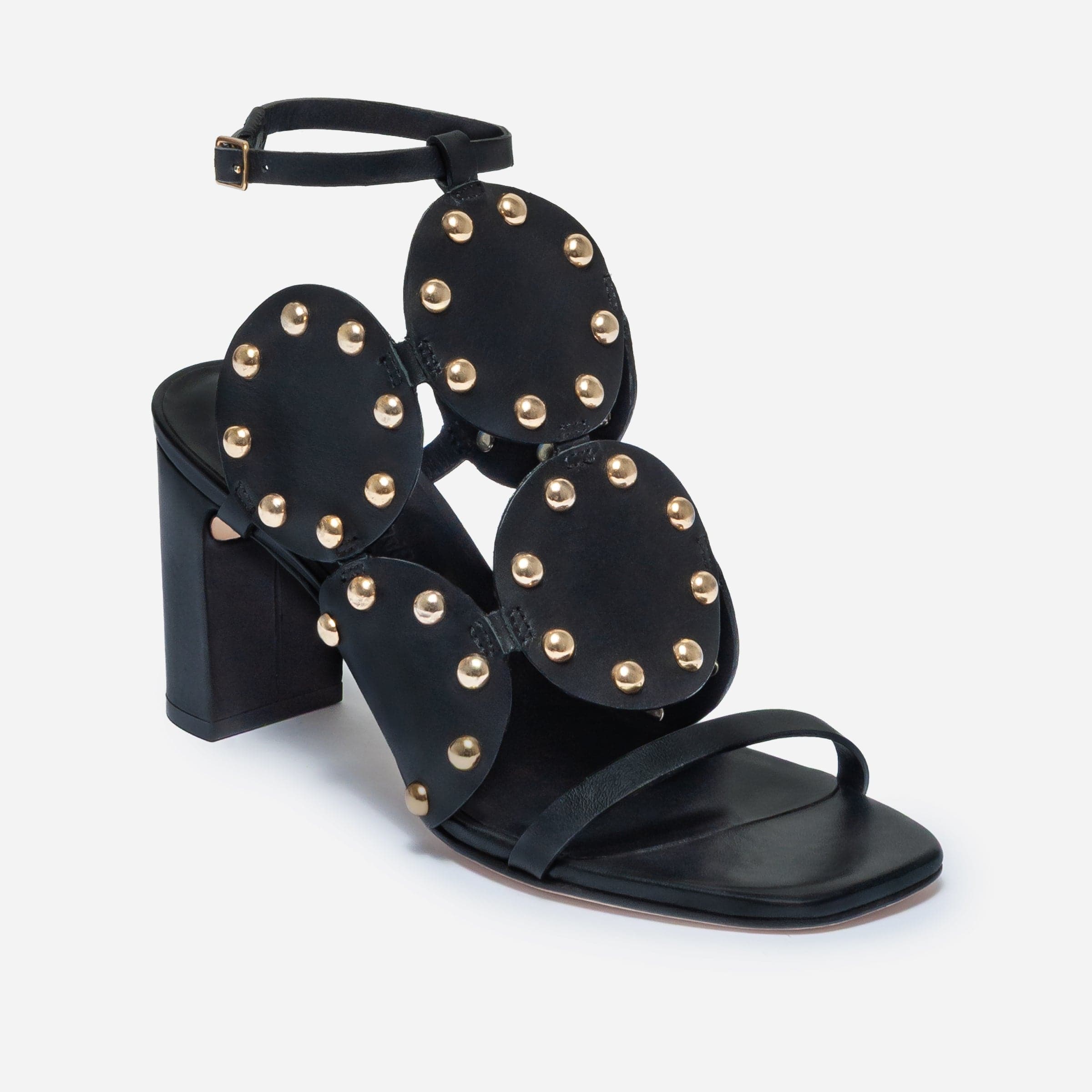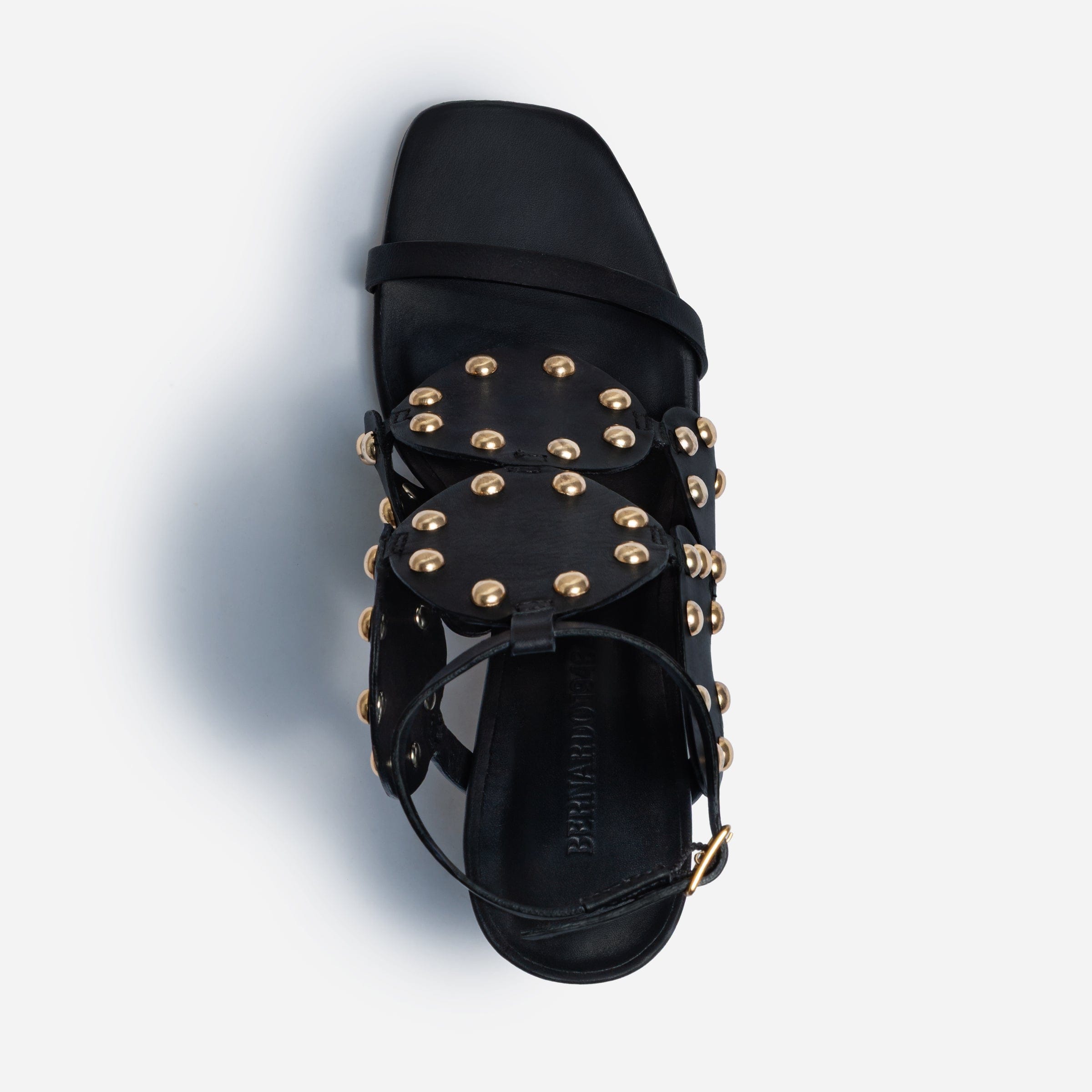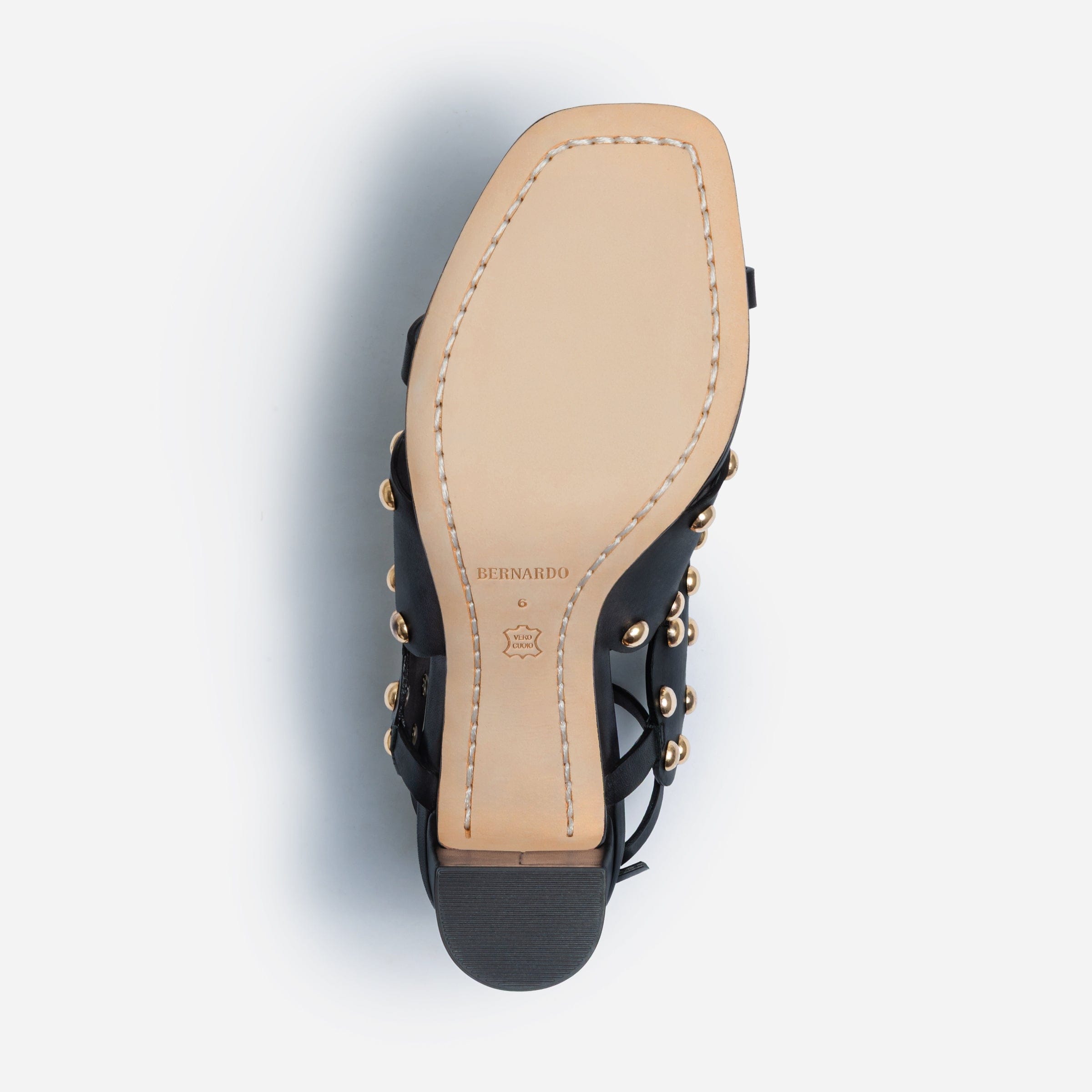 Eternal shapes - adorned. Adore yourself in this heeled sandal that celebrates a heritage Bernardo design by placing its iconic geometric upper atop a versatile covered heel and now detailed with statement gold metal studs.