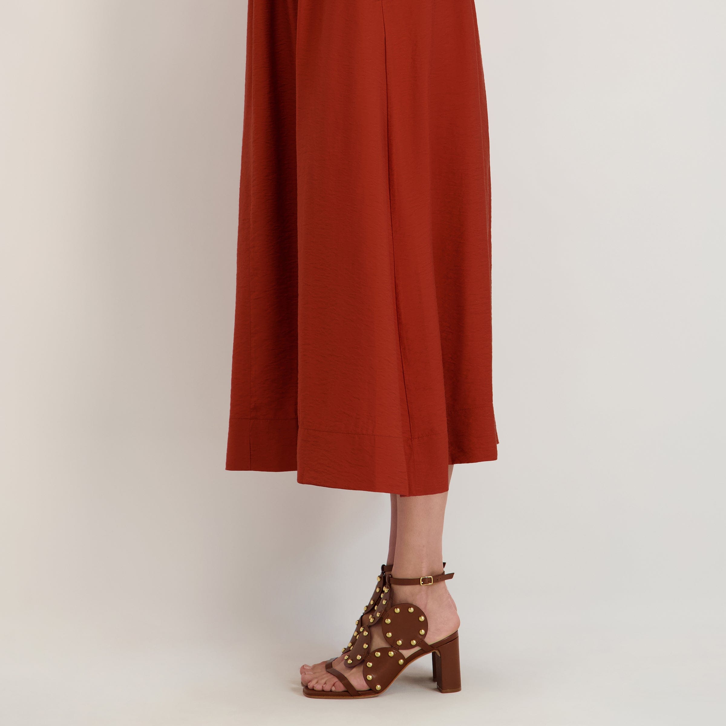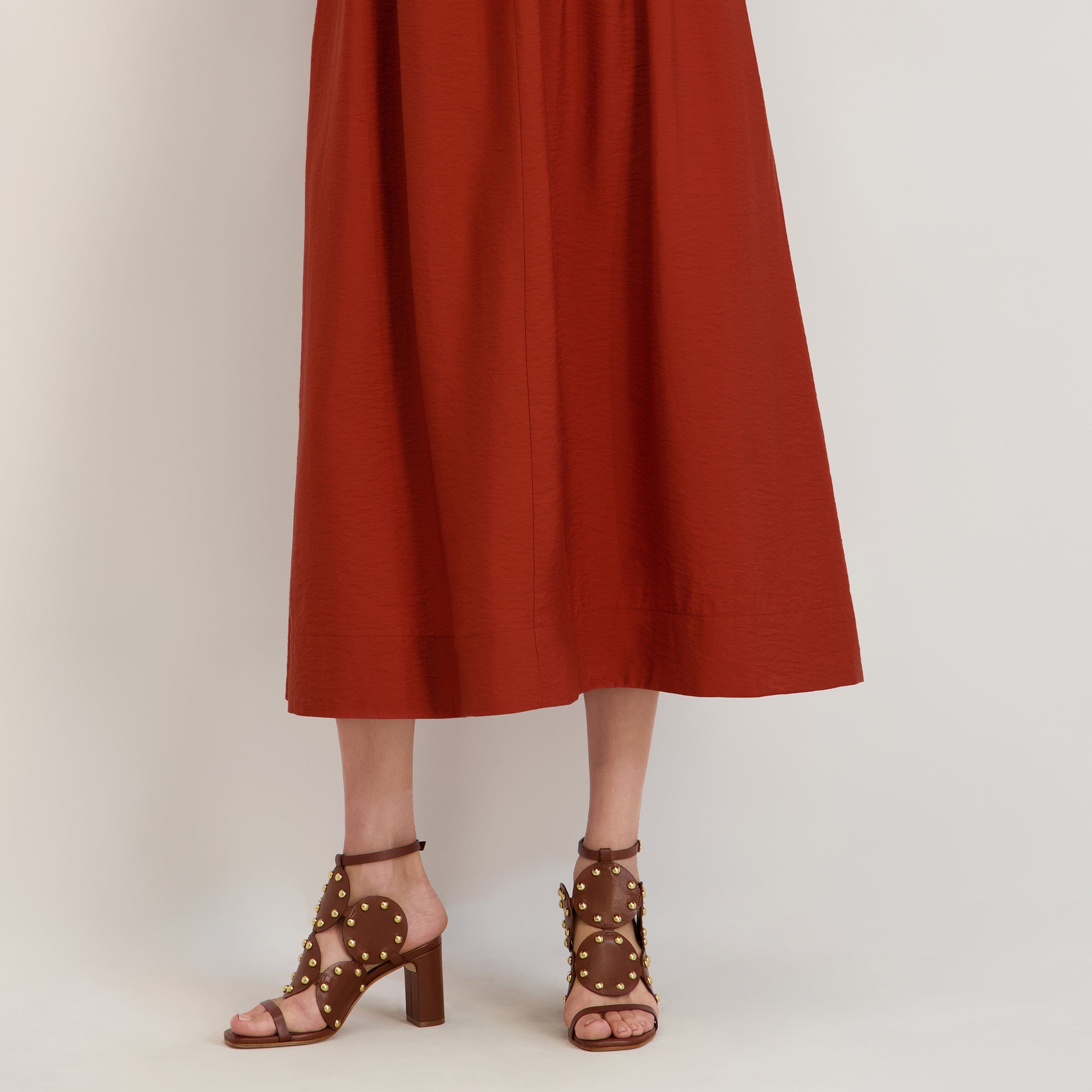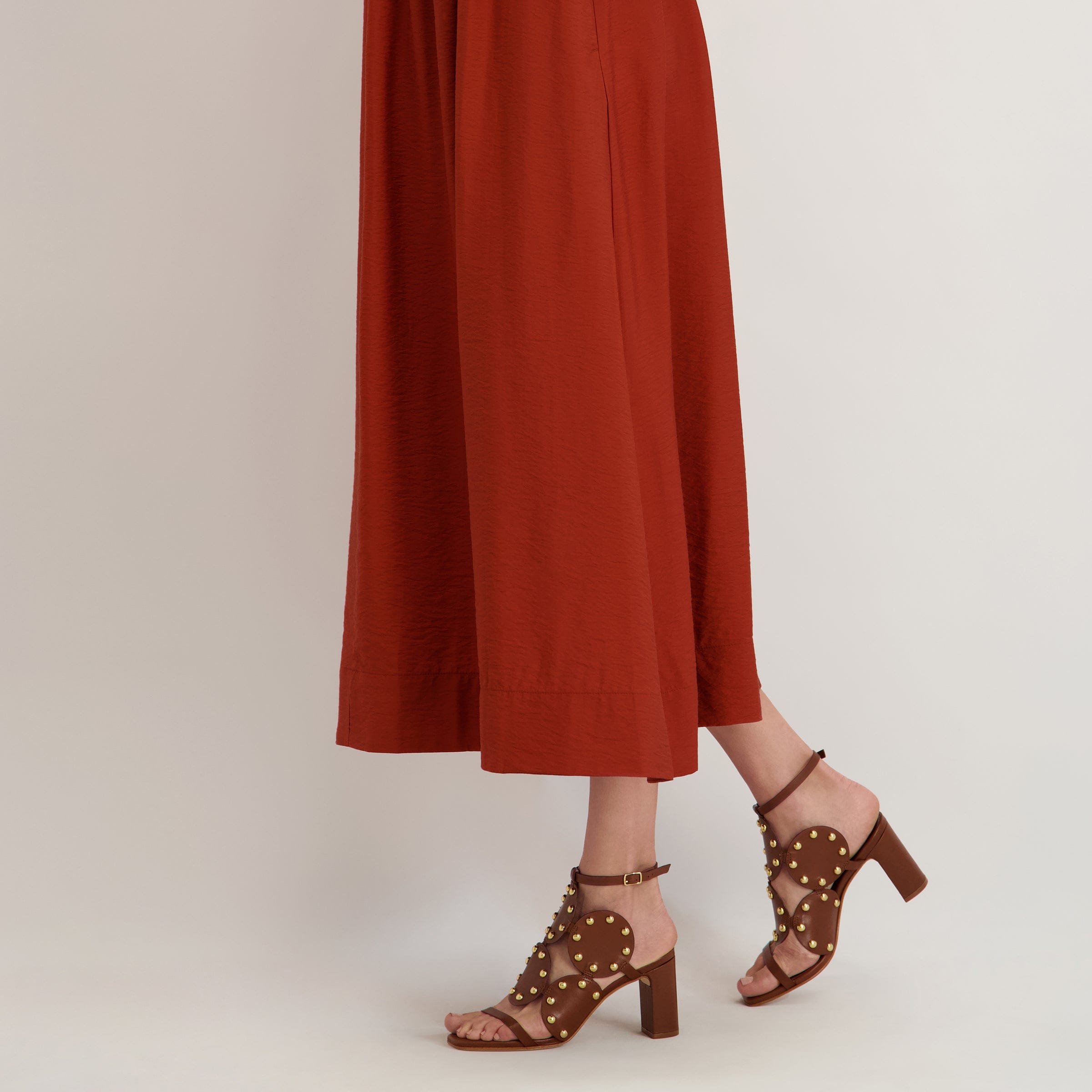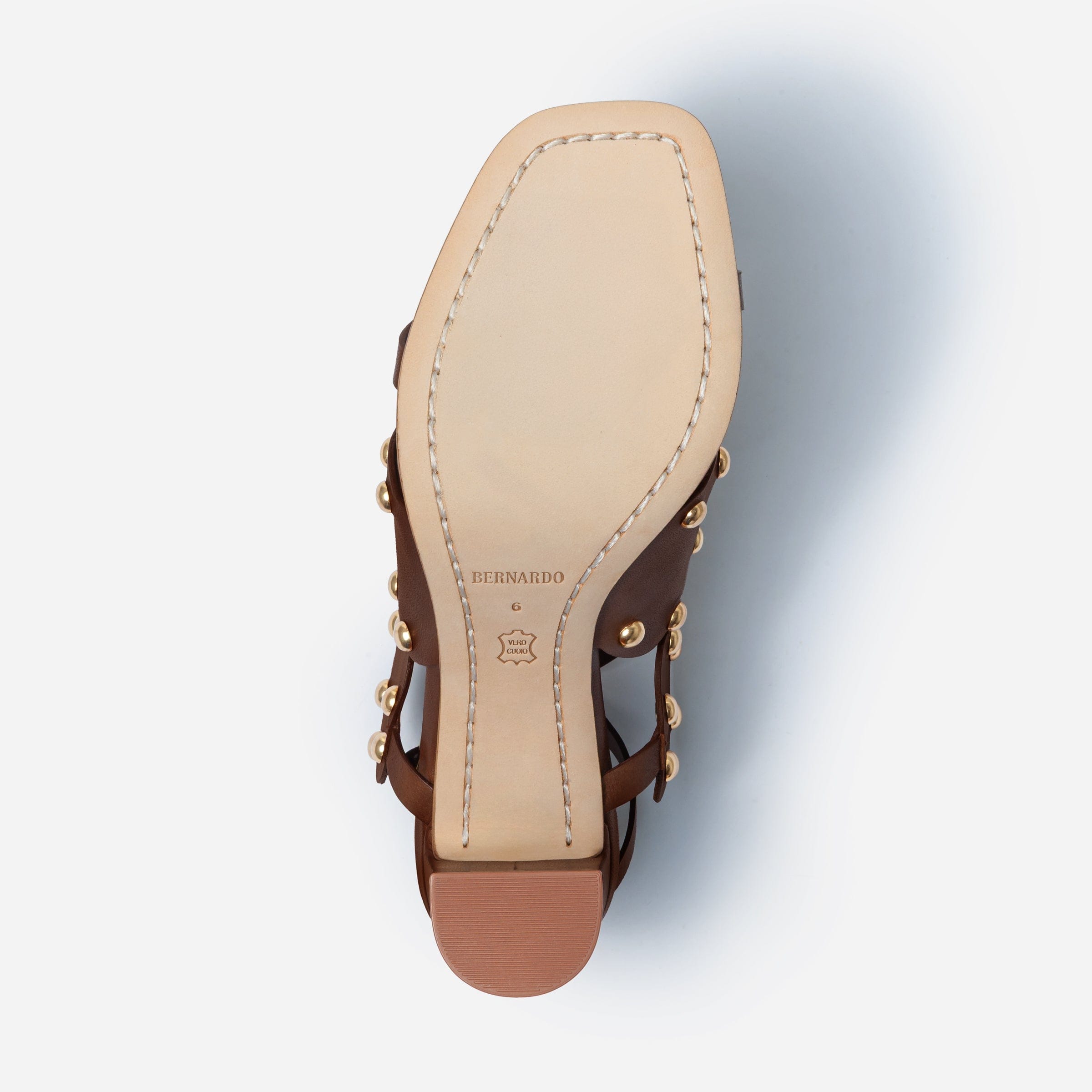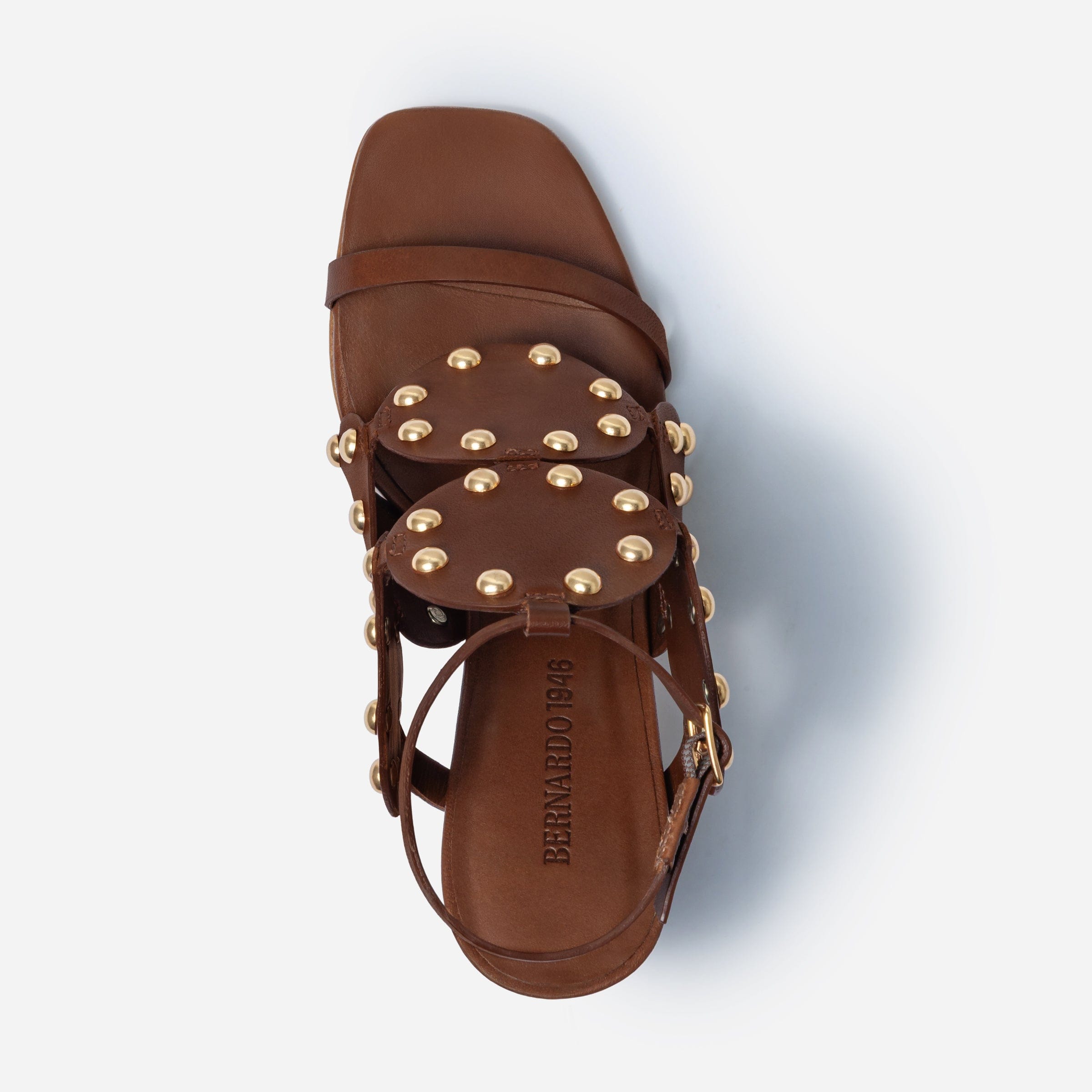 Eternal shapes - adorned. Adore yourself in this heeled sandal that celebrates a heritage Bernardo design by placing its iconic geometric upper atop a versatile covered heel and now detailed with statement gold metal studs.