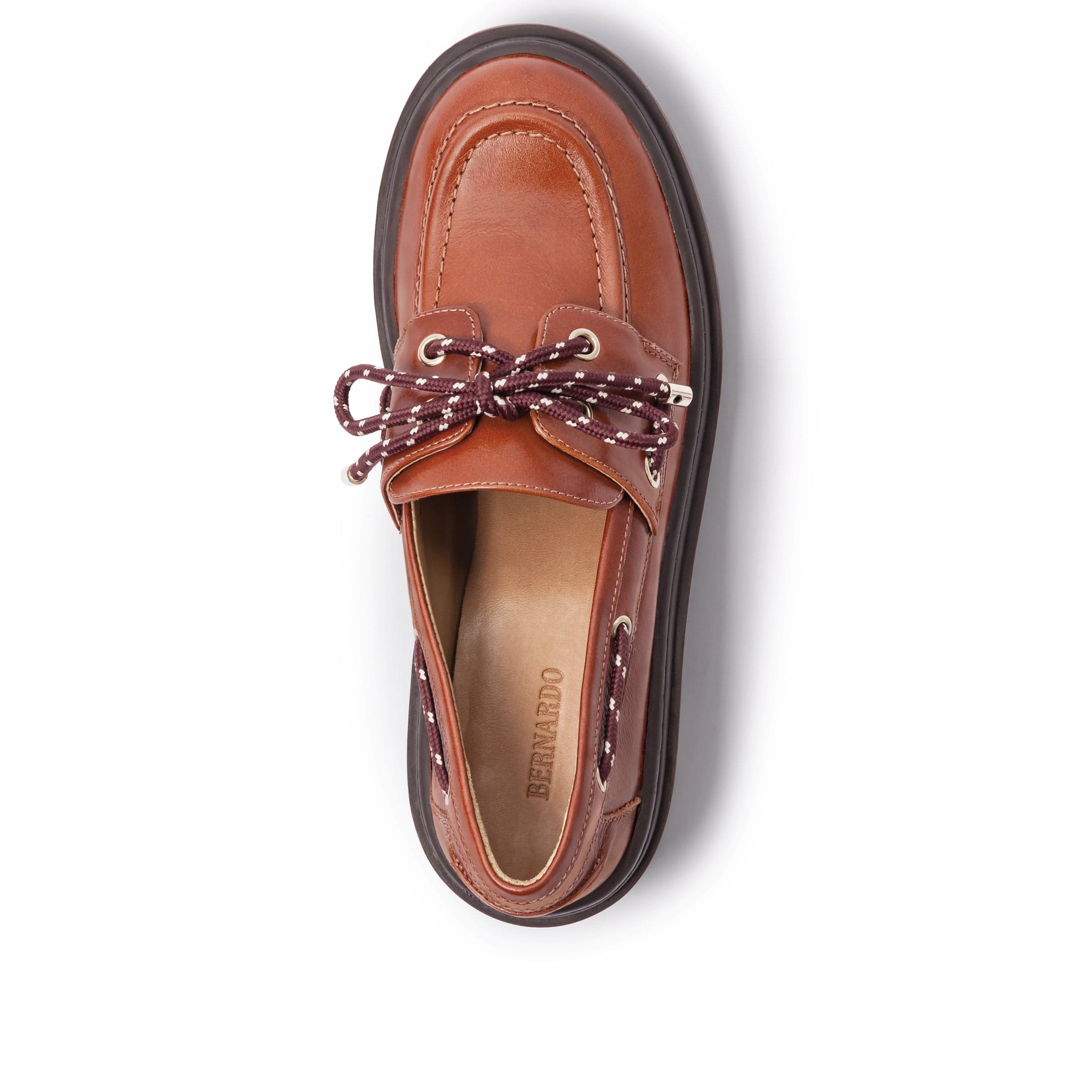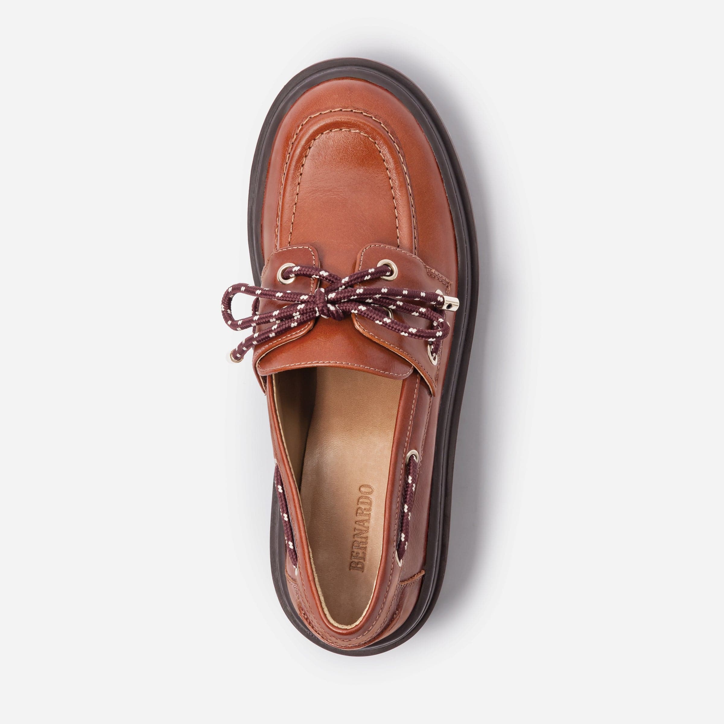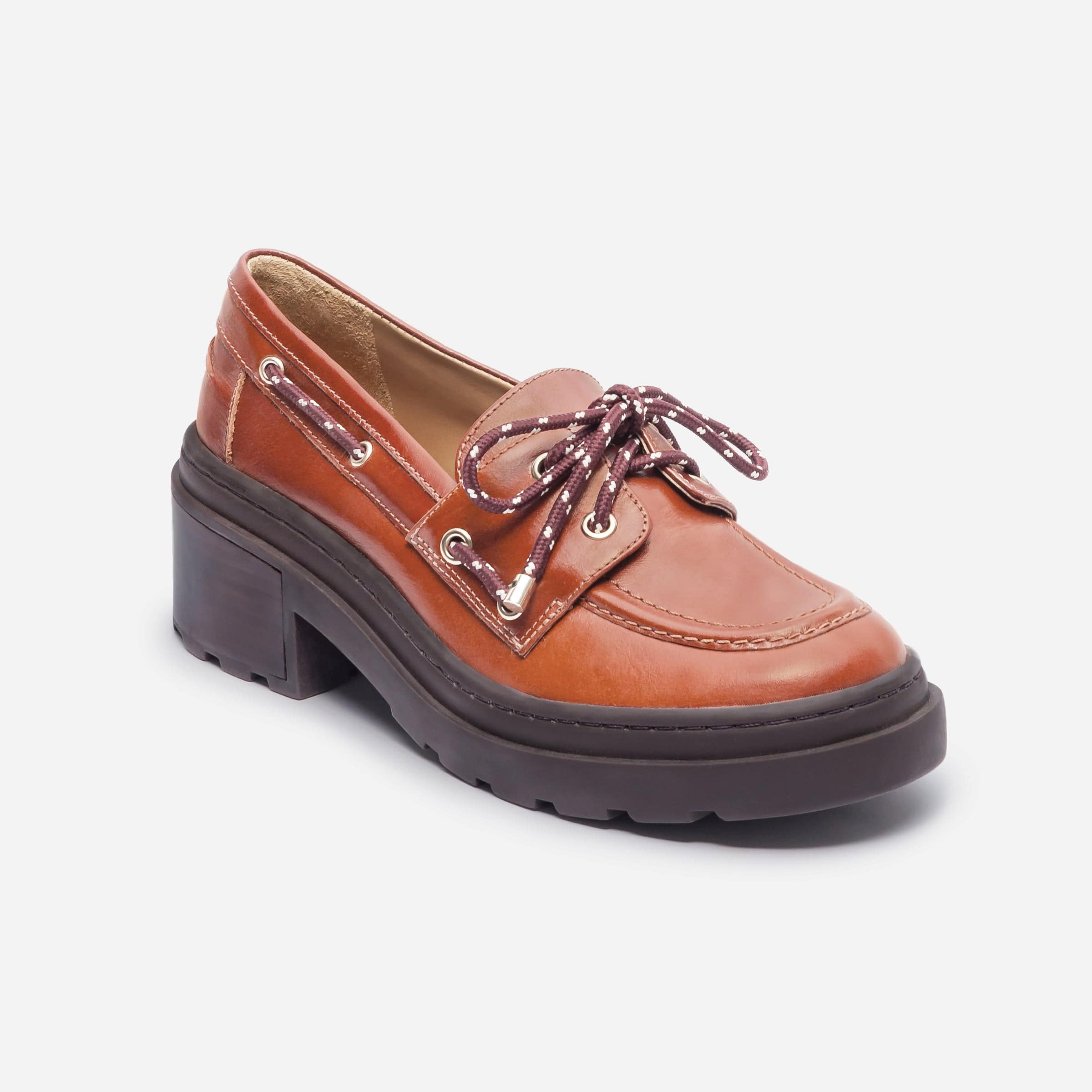 Sail away. This no-ordinary boat shoe sits atop a heavy lug sole adding preppy quirk, comfort, and height to any look. Finishing touches include a classic wood-stacked heel and contrast laces to complete the reimagined nautical classic.