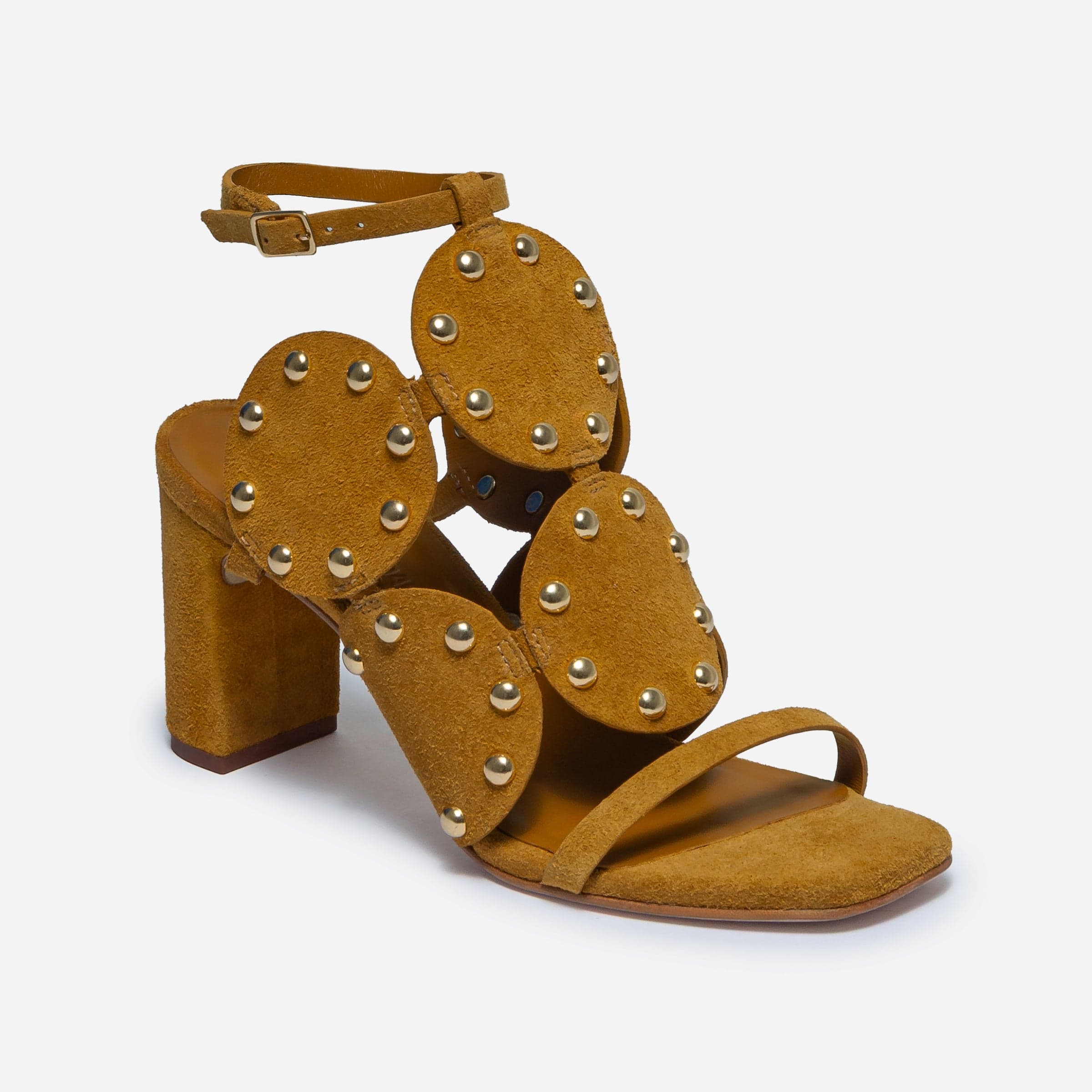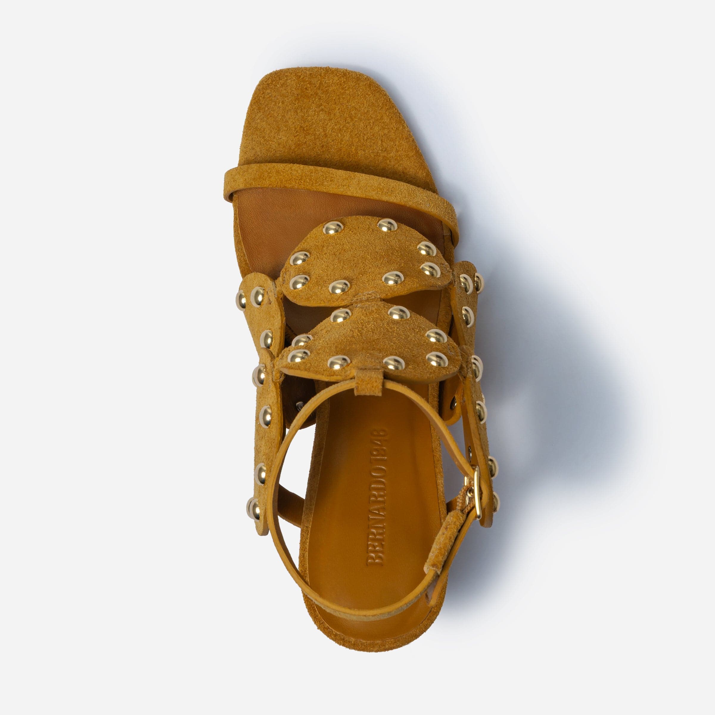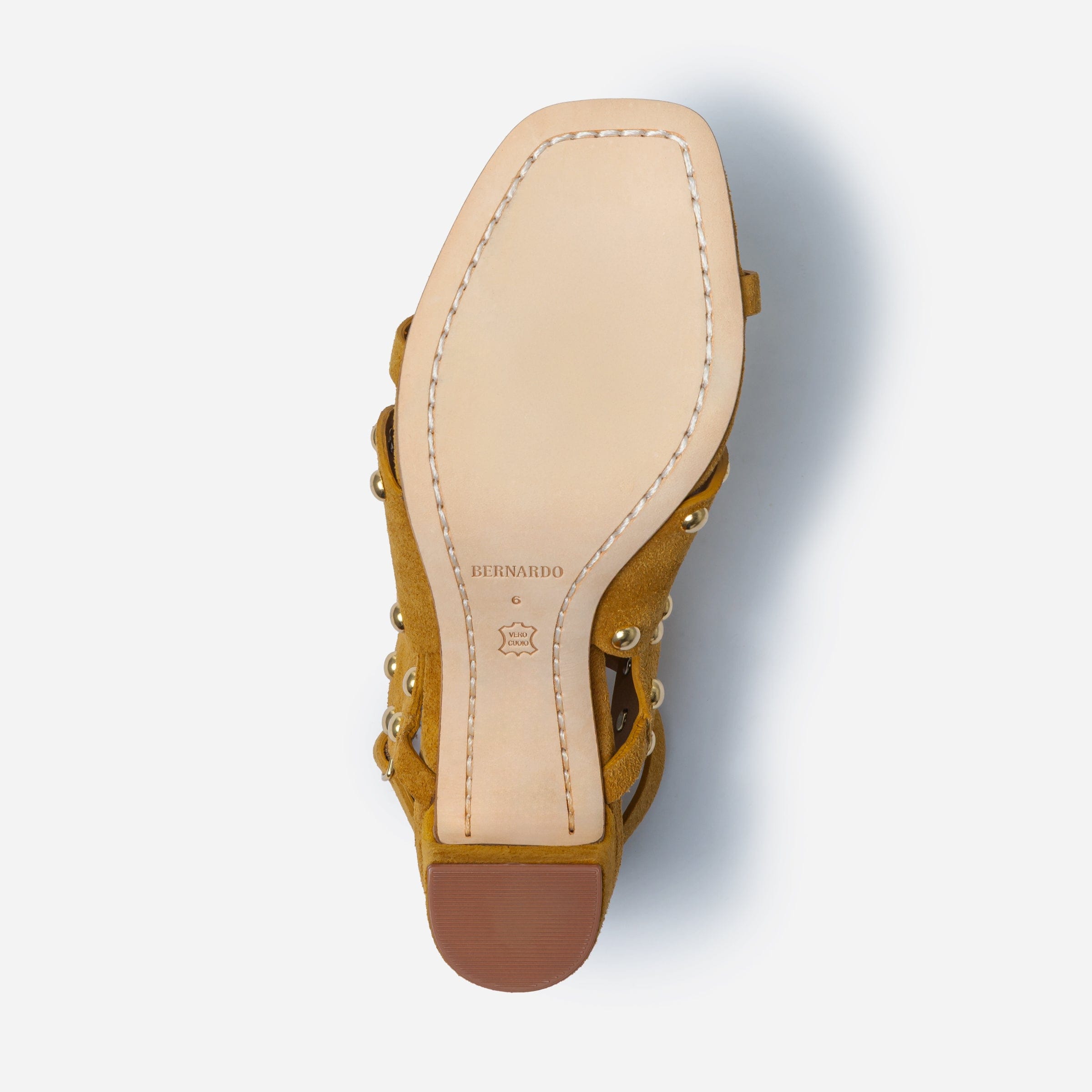 Eternal shapes - adorned. Adore yourself in this heeled sandal that celebrates a heritage Bernardo design by placing its iconic geometric upper atop a versatile covered heel and now detailed with statement gold metal studs.