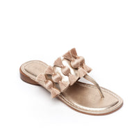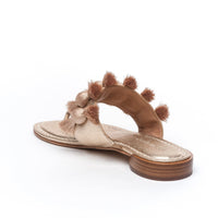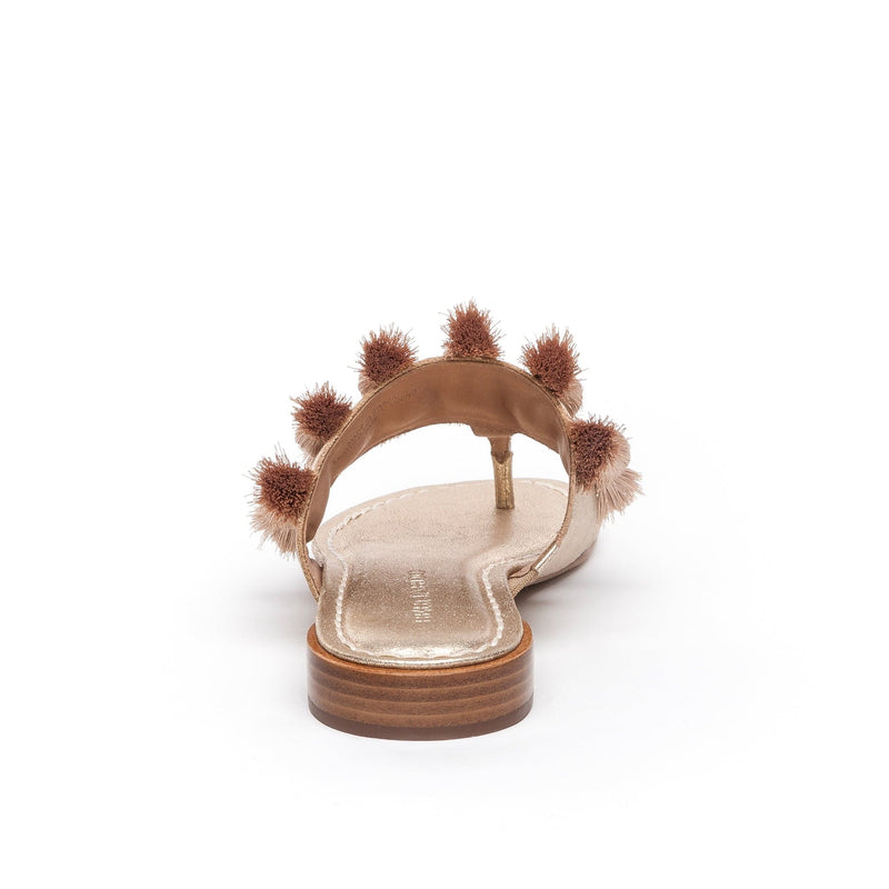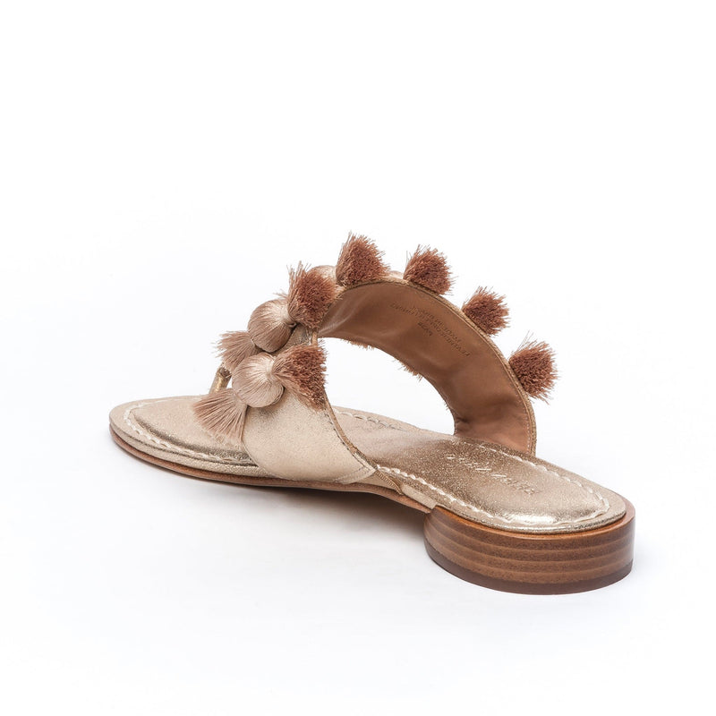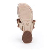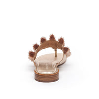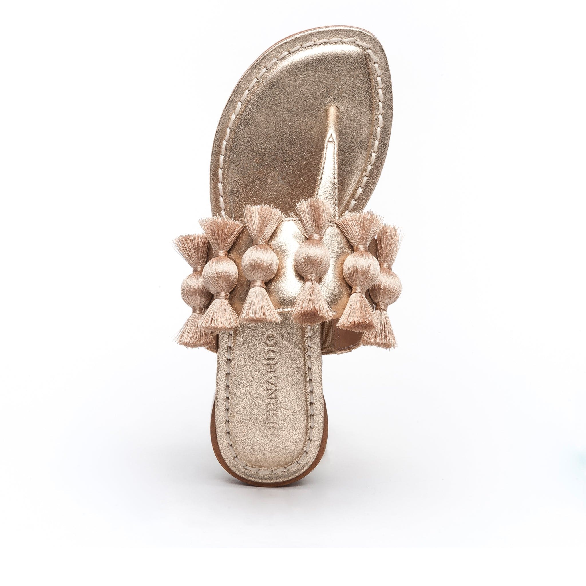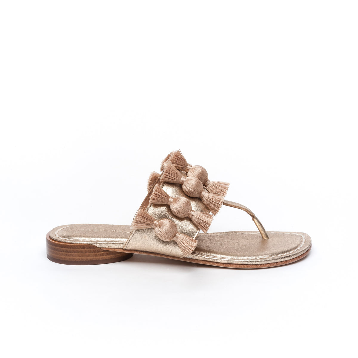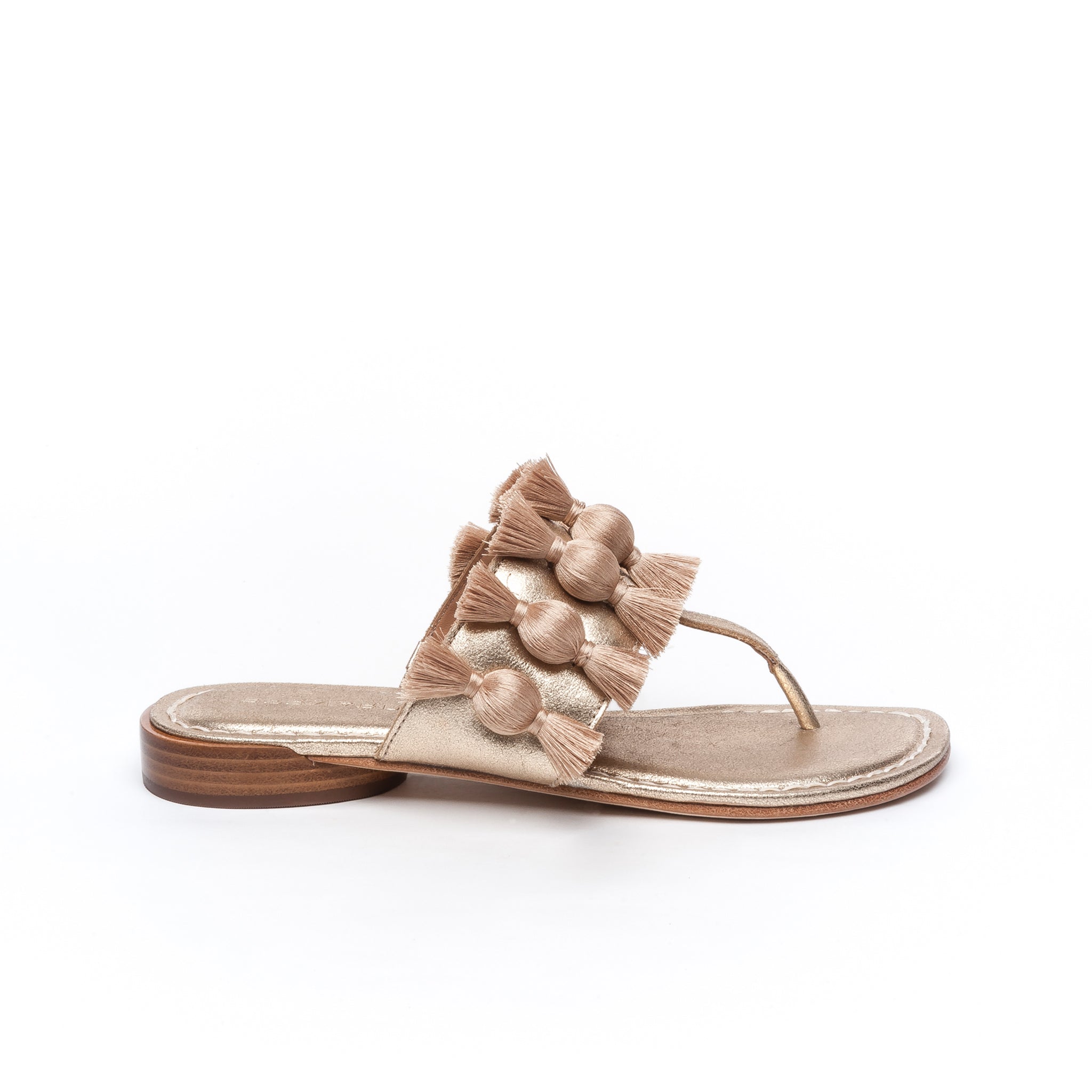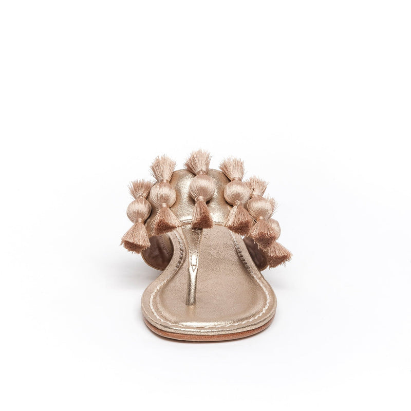 The Tara is a striking leather thong sandal with adorable candy-shaped fabric tassels adorning the center strap. A great complement to provide material interest to any outfit, make sure to let your Tara's take centerstage.