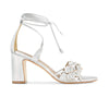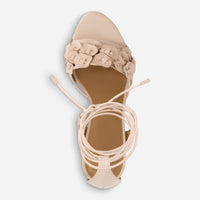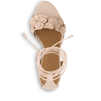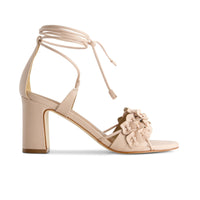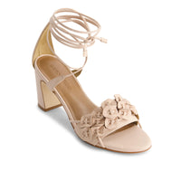 Floral, flirty, fun. This block heeled sandal features dimensional floral accents and delicate wraparound ankle ties adding a playful touch of romance while ensuring a secure and flattering fit.